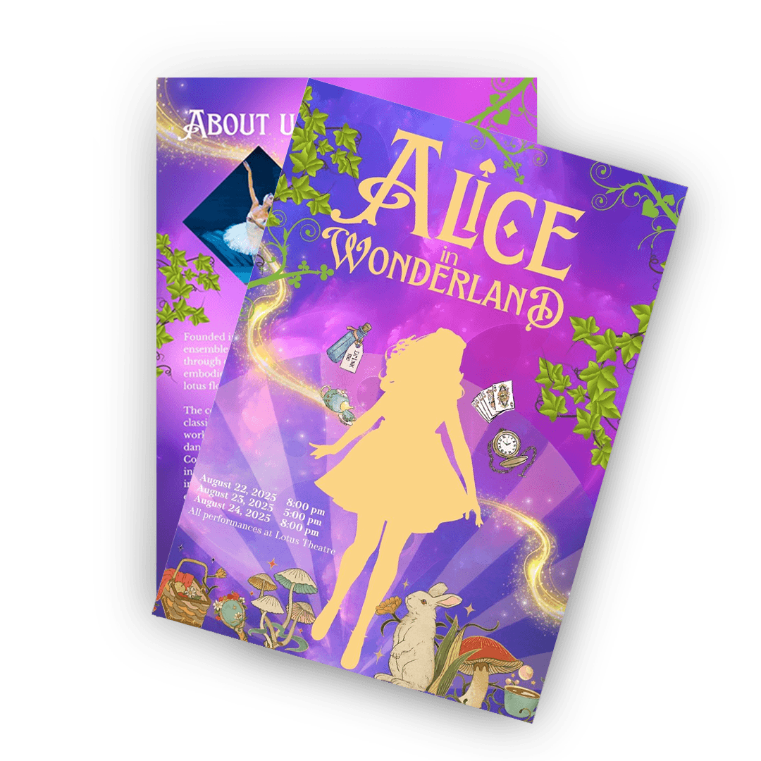 Create the perfect start for your Alice in Wonderland show with this easy to use Canva playbill template. Get your audience engaged early and get them excited to go on an imaginative journey with Alice into a whimsical world filled with peculiar creatures, mad tea parties and mind-bending adventures.